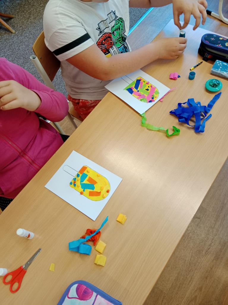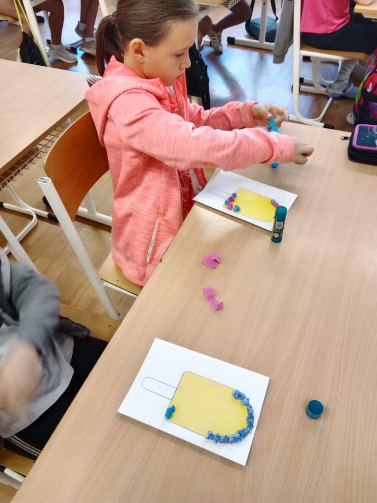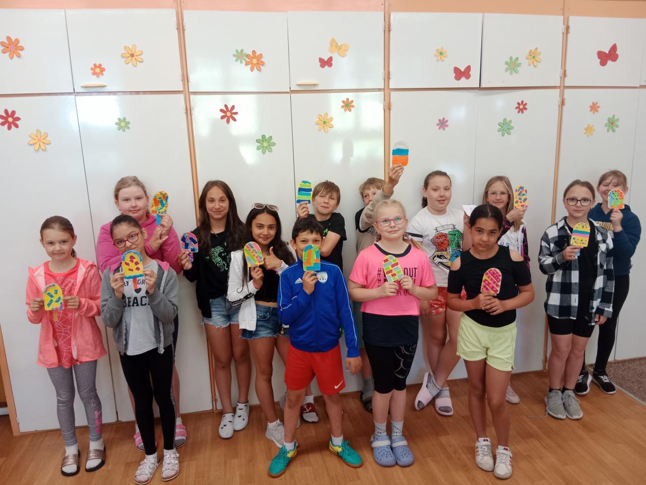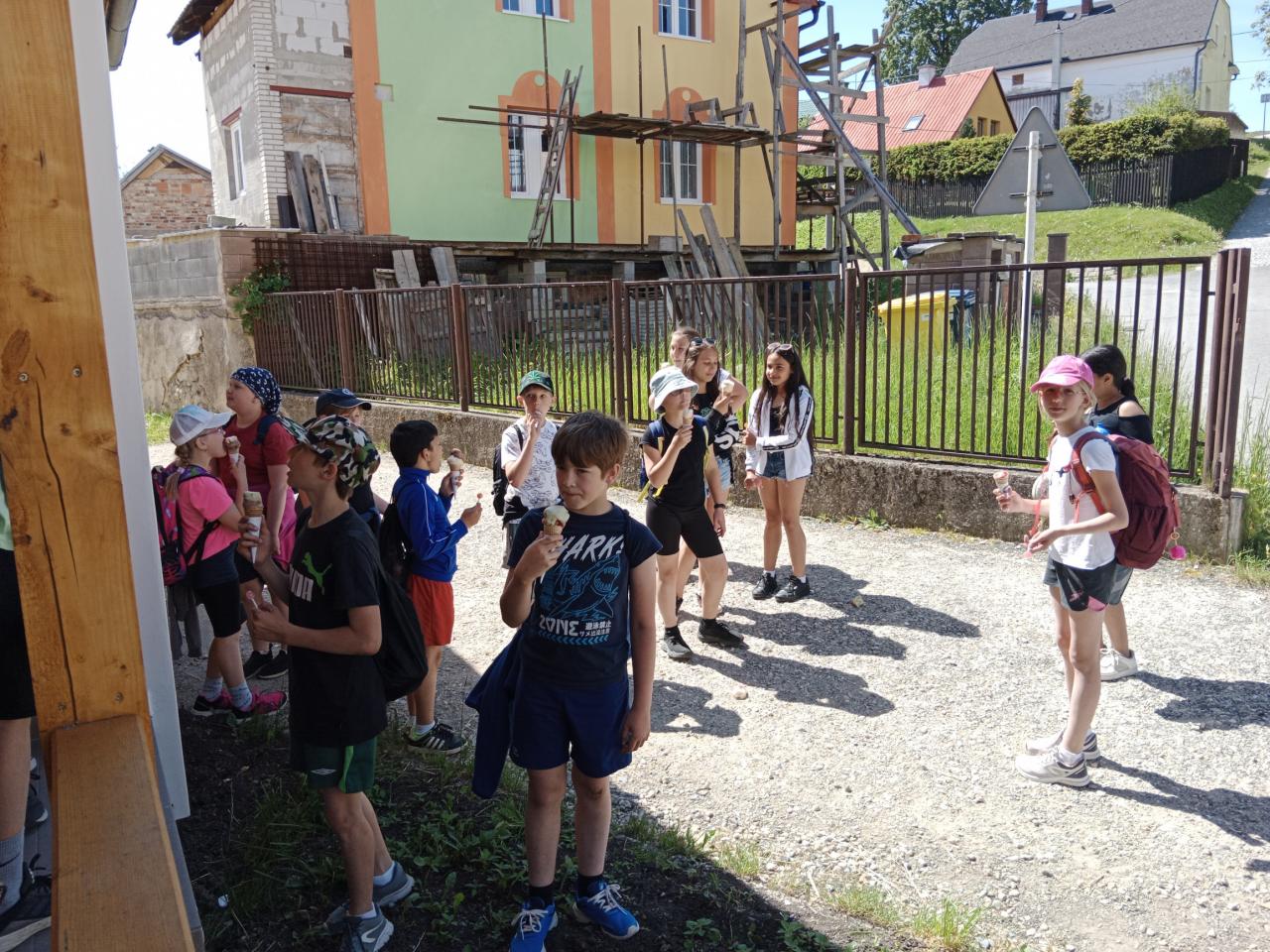 Ráno jsme se všichni sešli ve třídě a protože venku hřálo sluníčko,rozhodli jsme se, že se trochu zchladíme. Den jsme započali výrobou nanuků, i když jen těch papírových.To jsme ale ještě nevěděli co nás čeká později. Jako další bod na programu bylo plnění úkolů na stanovištích a to nás moc bavilo. Teplo bylo čím dál tím větší a proto nastal čas na překvapení. Opravdová zmrzlina! A ta nám teda bodla :) Po malém osvěžení následovala procházka na Křížový vrch,kde jsme v plnění úkolů pokračovali, když jsme ovšem došli k dětskému hřišti, bylo jasno,že zůstáváme a trochu se pobavíme i zde. Dopoledne se vydařilo, počasí nám přálo a my si to moc užili!