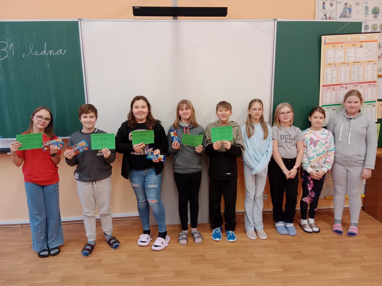 Dnes 31.1. jsme hned z rána zapojili hlavičky a pustili se do matematické soutěže dvojic čtvrtých a pátých tříd. A jak to dopadlo? 1.místo A. Honajzerová a T.Kozelek 2.místo H.Krmelová a K.Hanišová 3.místo P.J.Červinka a F.Lacko (4.třída)