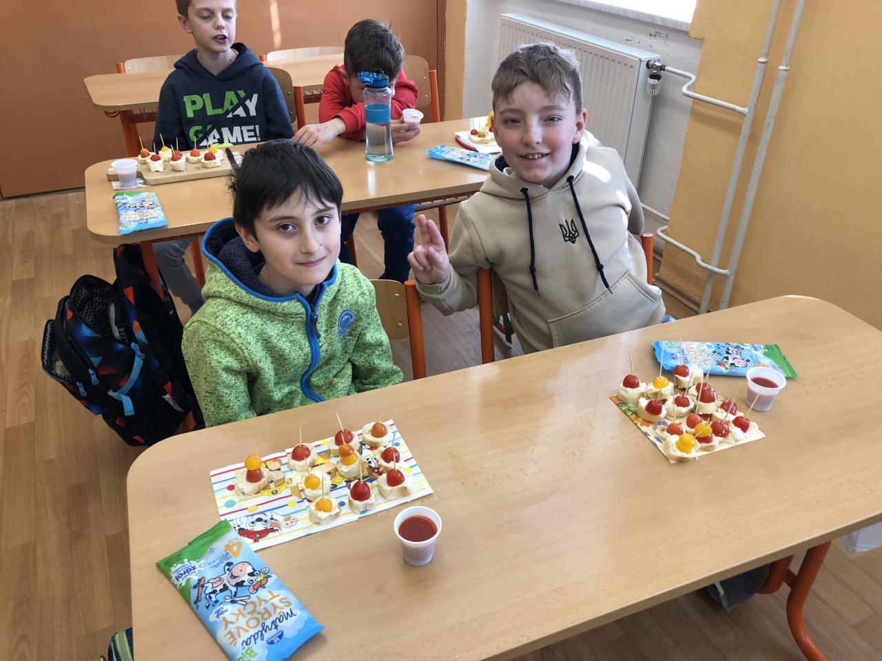 V hodině PČ si žáci vyrobili své vlastní zdravé jednohubky. Nejen, že měli svačinku, ale také se dozvěděli spoustu zajímavostí o rajčatech a jejich druzích. Jako bonus mohli ochutnat i rajčatový džus.
