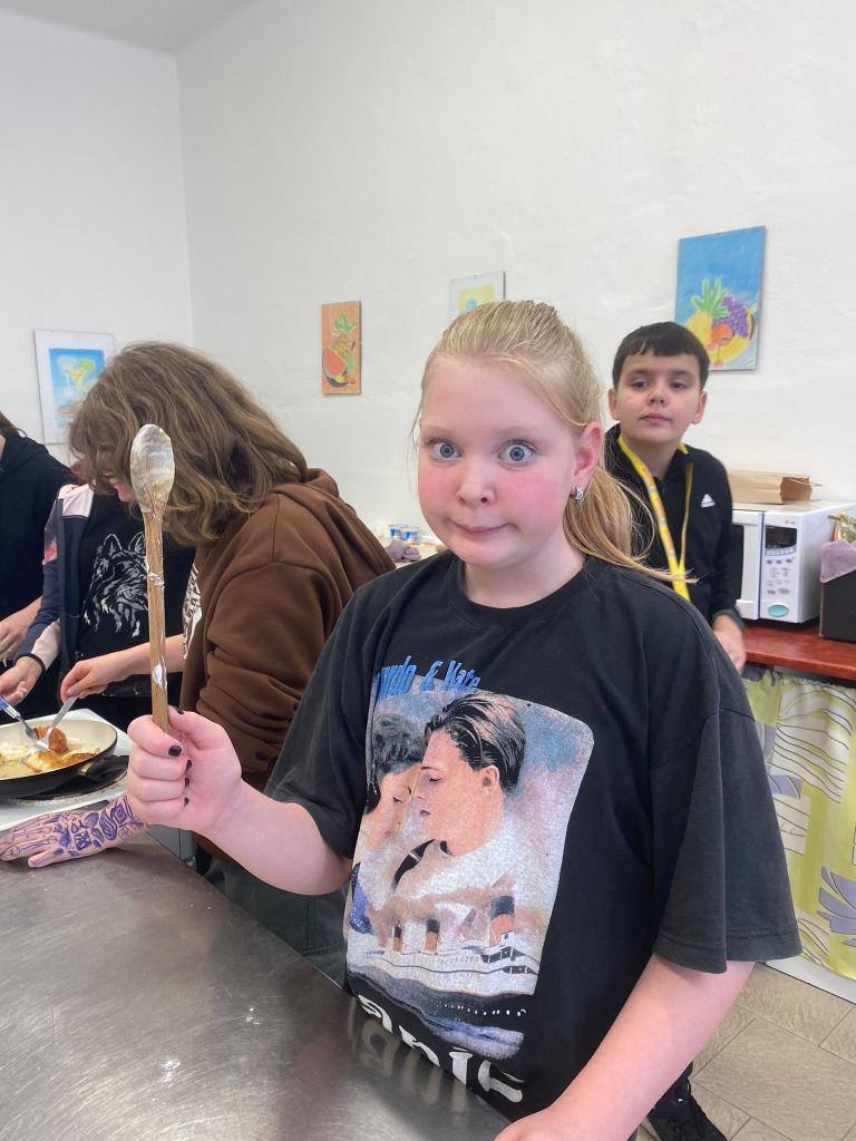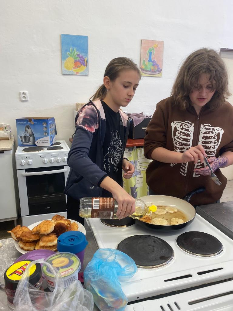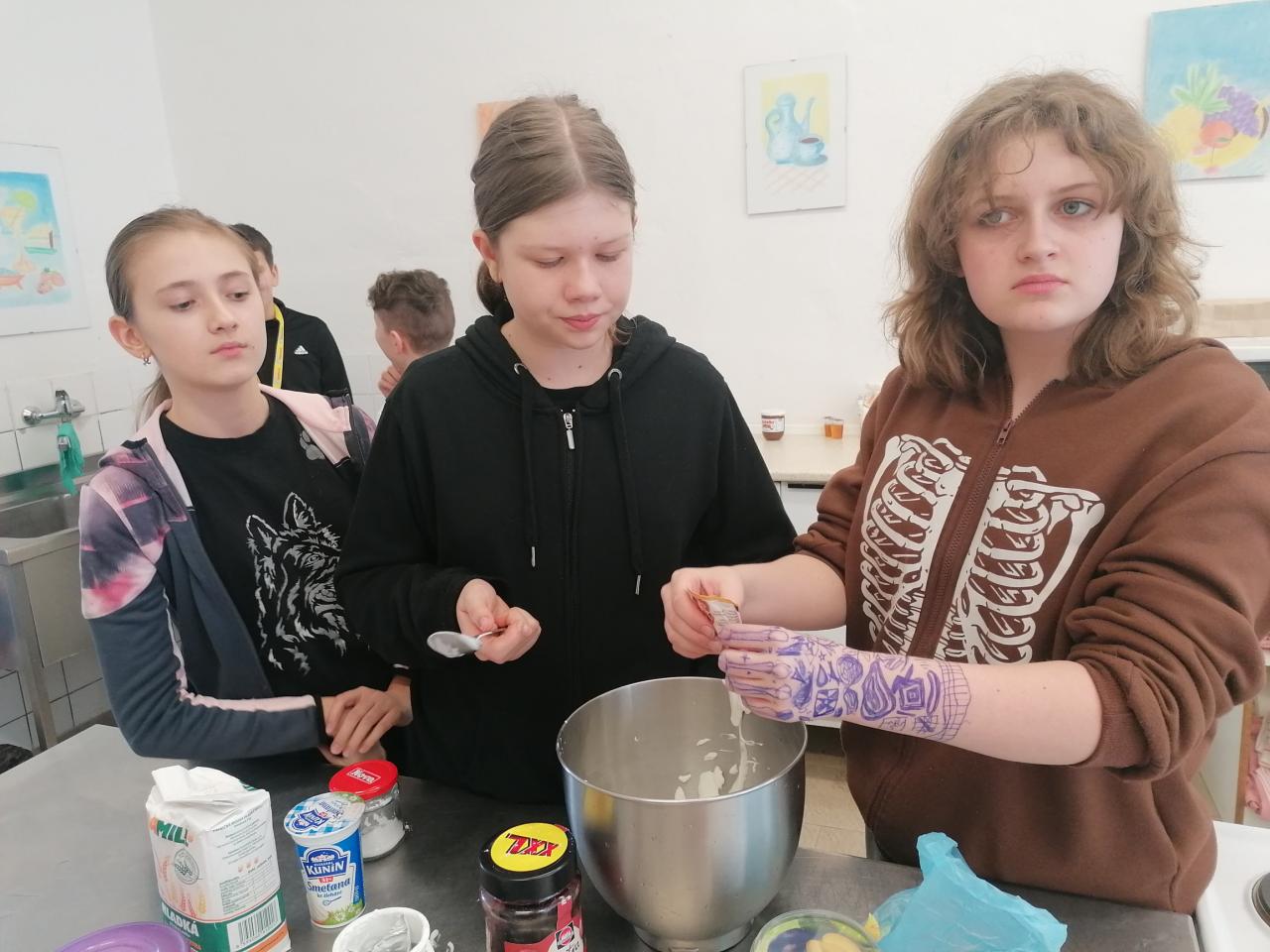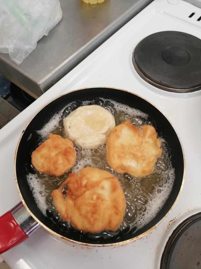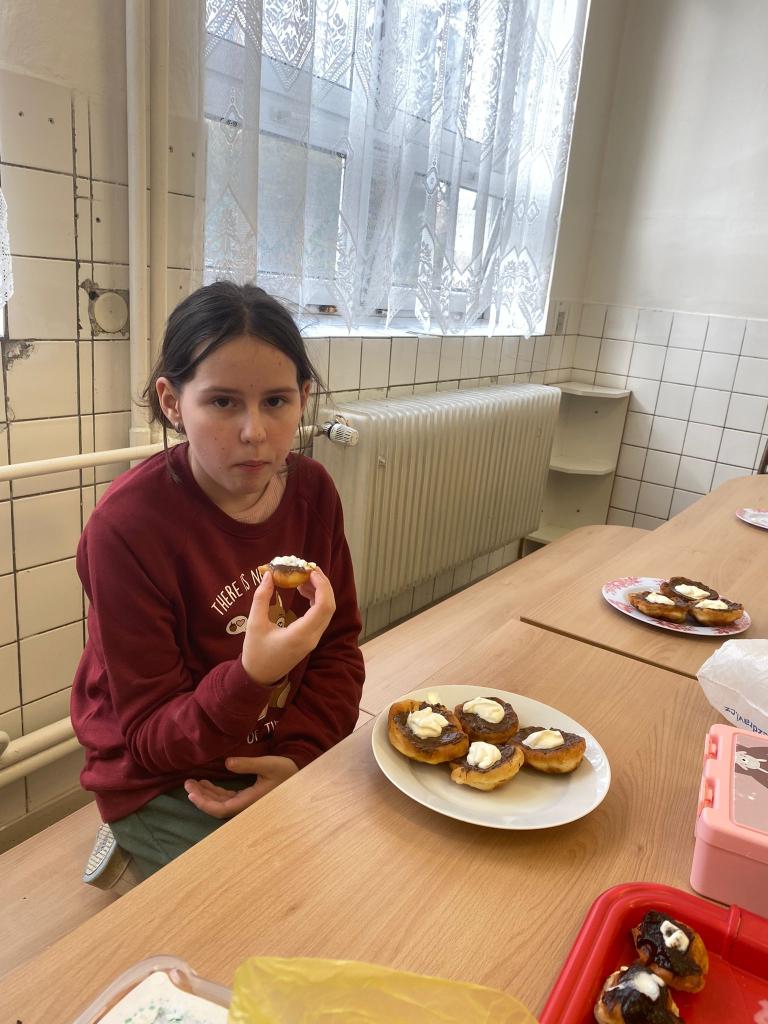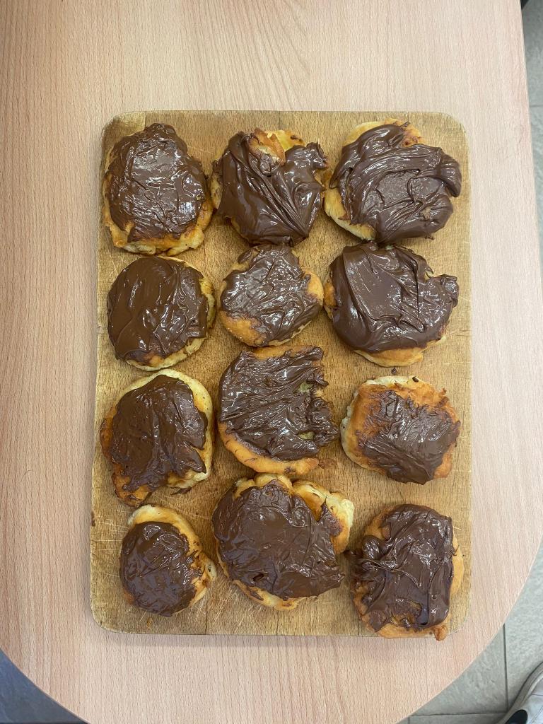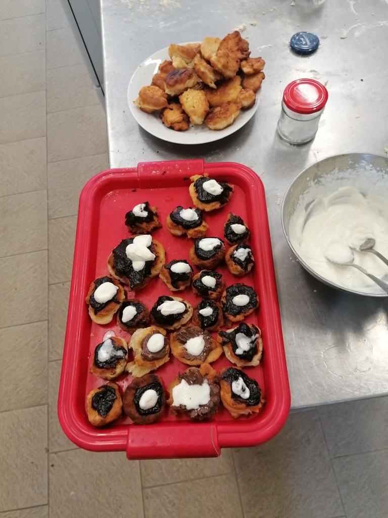 Poprvé jsme zkoušeli koblížky bez kynutí a myslím, že se povedly. Těsto trošku lepilo, ale s tím jsme si snadno poradili. Kuchtíci si na ně dávali nutelu, šlehačku a povidla. Byly vynikající.